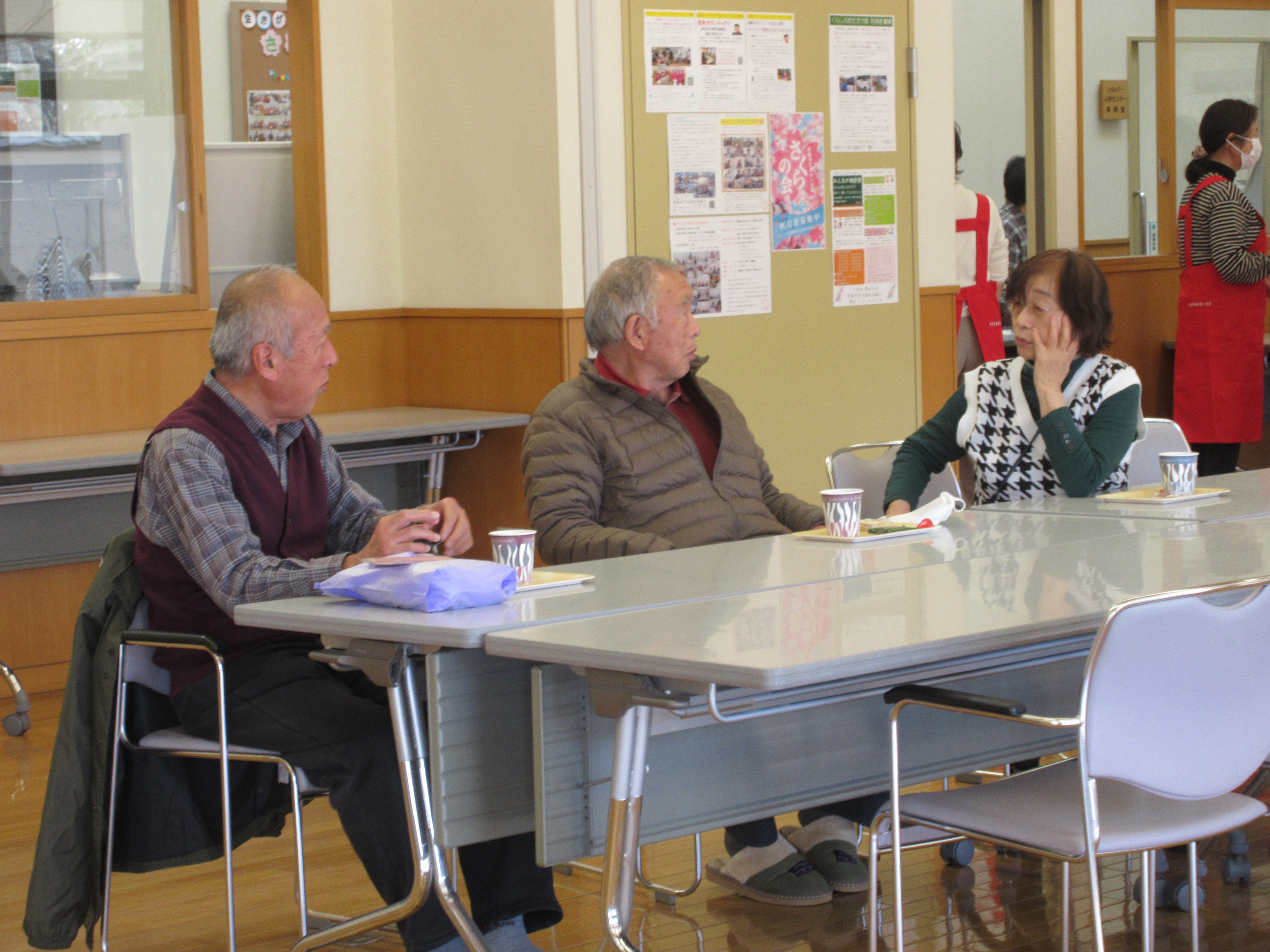 温かい飲み物(夏場は冷たい飲み物)や参加している方々やボランティアさんとの会話も楽しみませんか。人によっては外の景色を眺めて時の流れを飲み物と一緒に楽しんでいる方もいますよ。