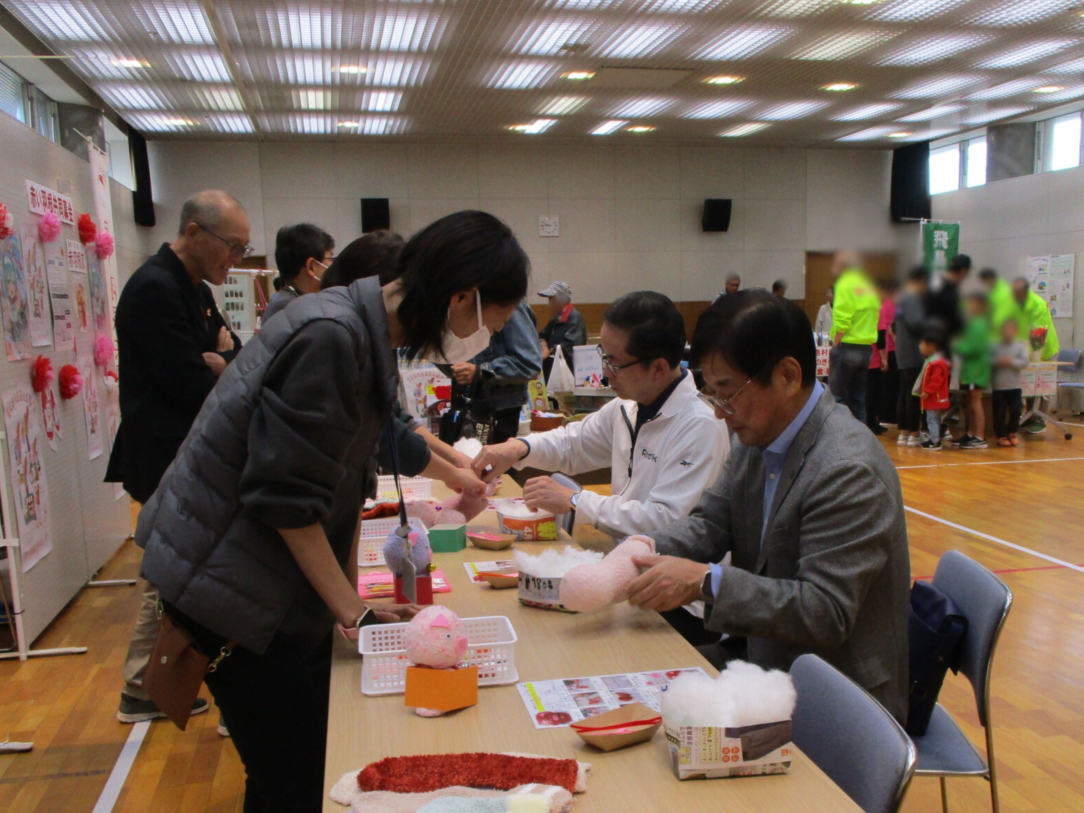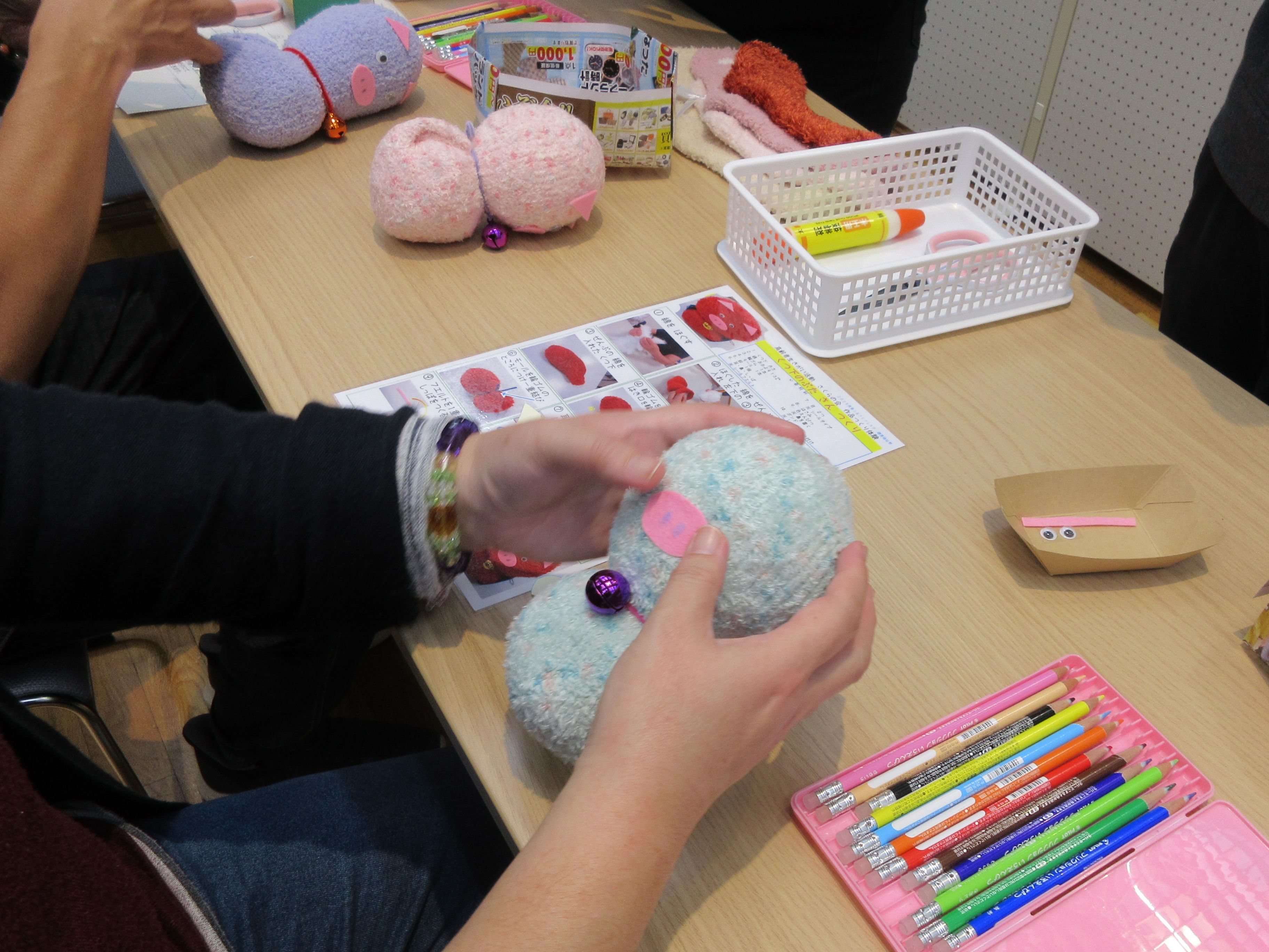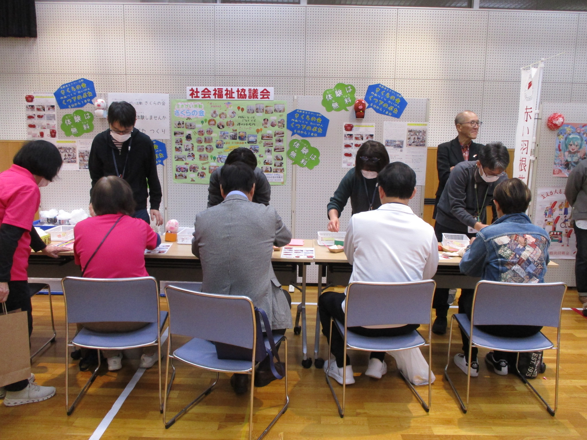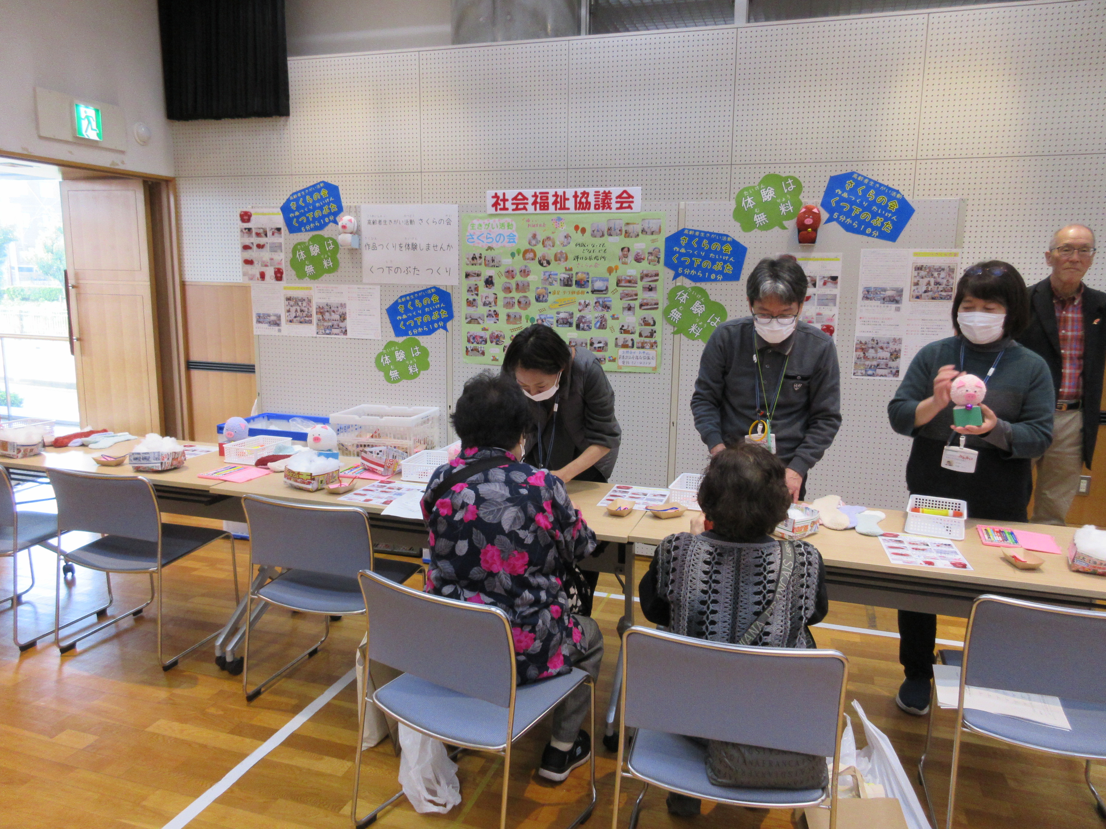 11月1日の健康福祉祭では、高齢者生きがい活動支援事業(さくらの会)の作品つくり「くつ下のぶたさん」つくりの体験ブースをはじめ赤い羽根共同募金活動、心身障害者小規模授産施設さくら作業所の自主製品販売のブースを出展し、点訳の『いととんぼ』のボランティアさんにも協力していただき、点字を打つ体験ブースも出展しました。