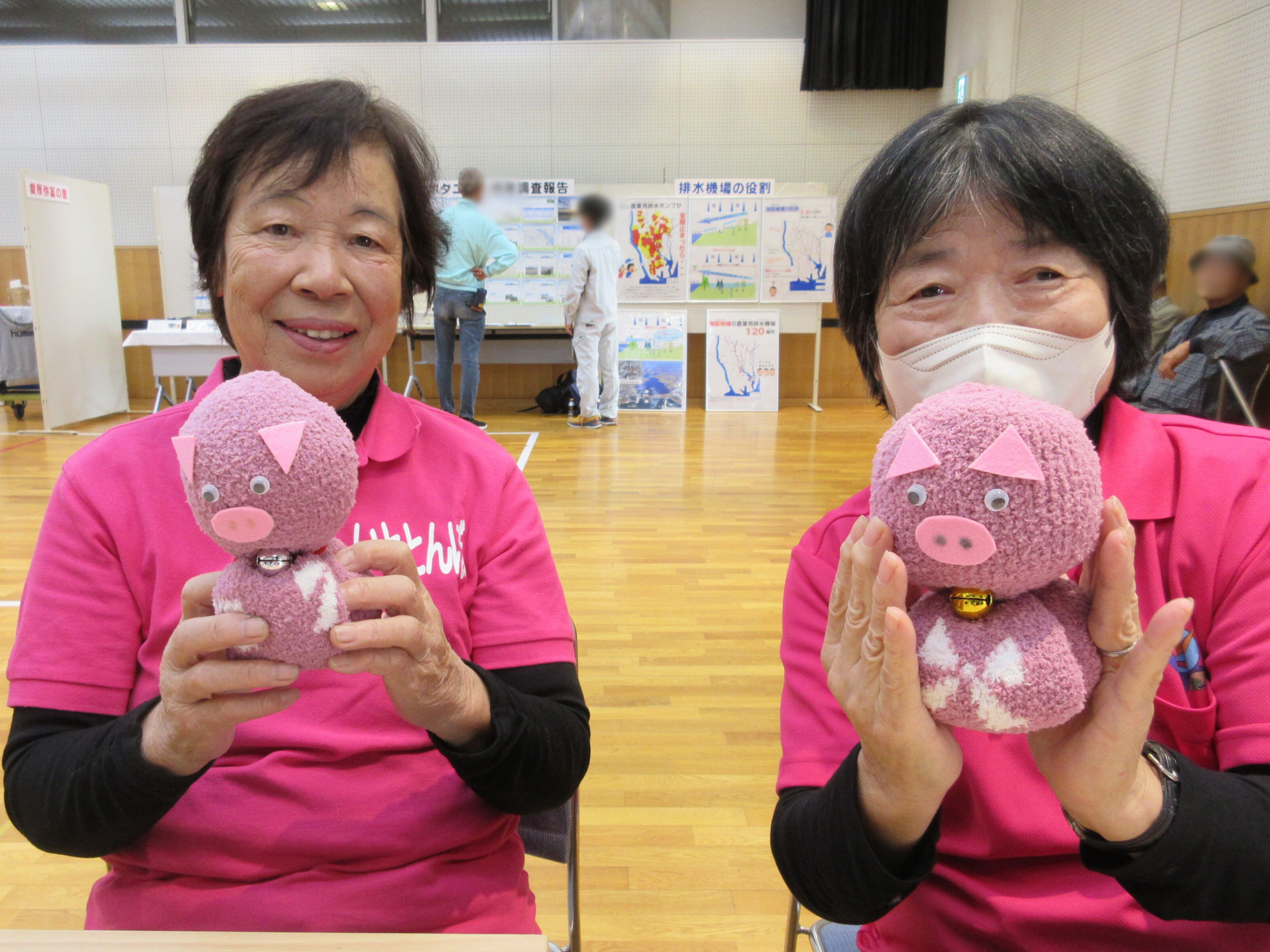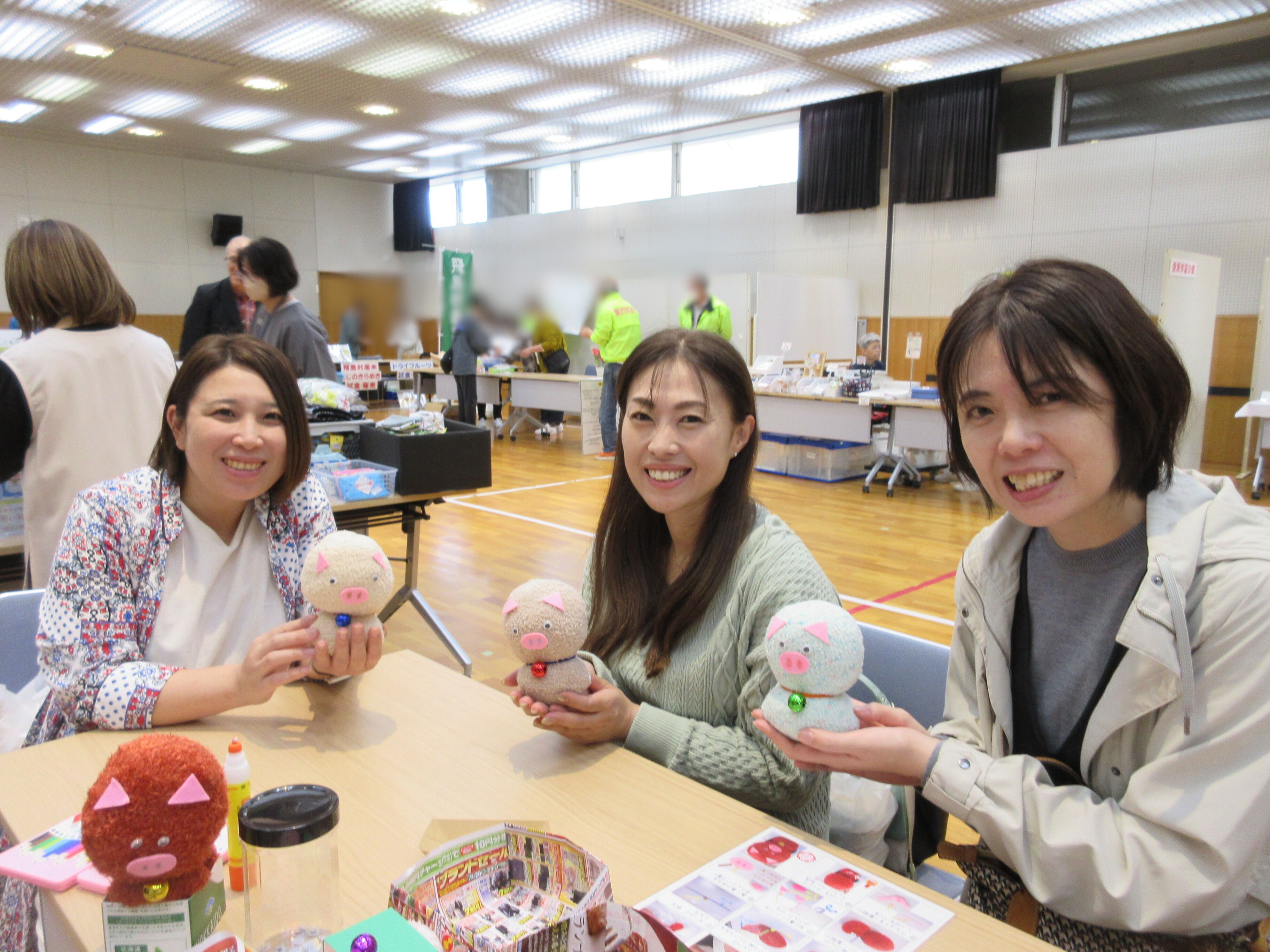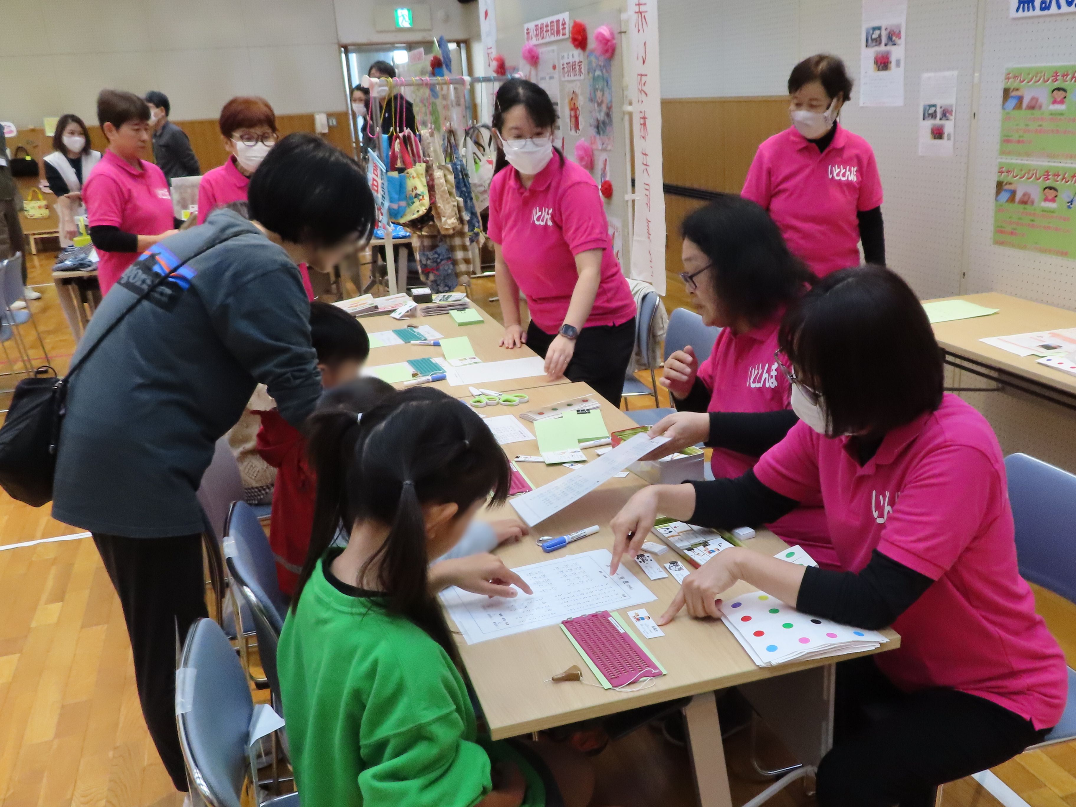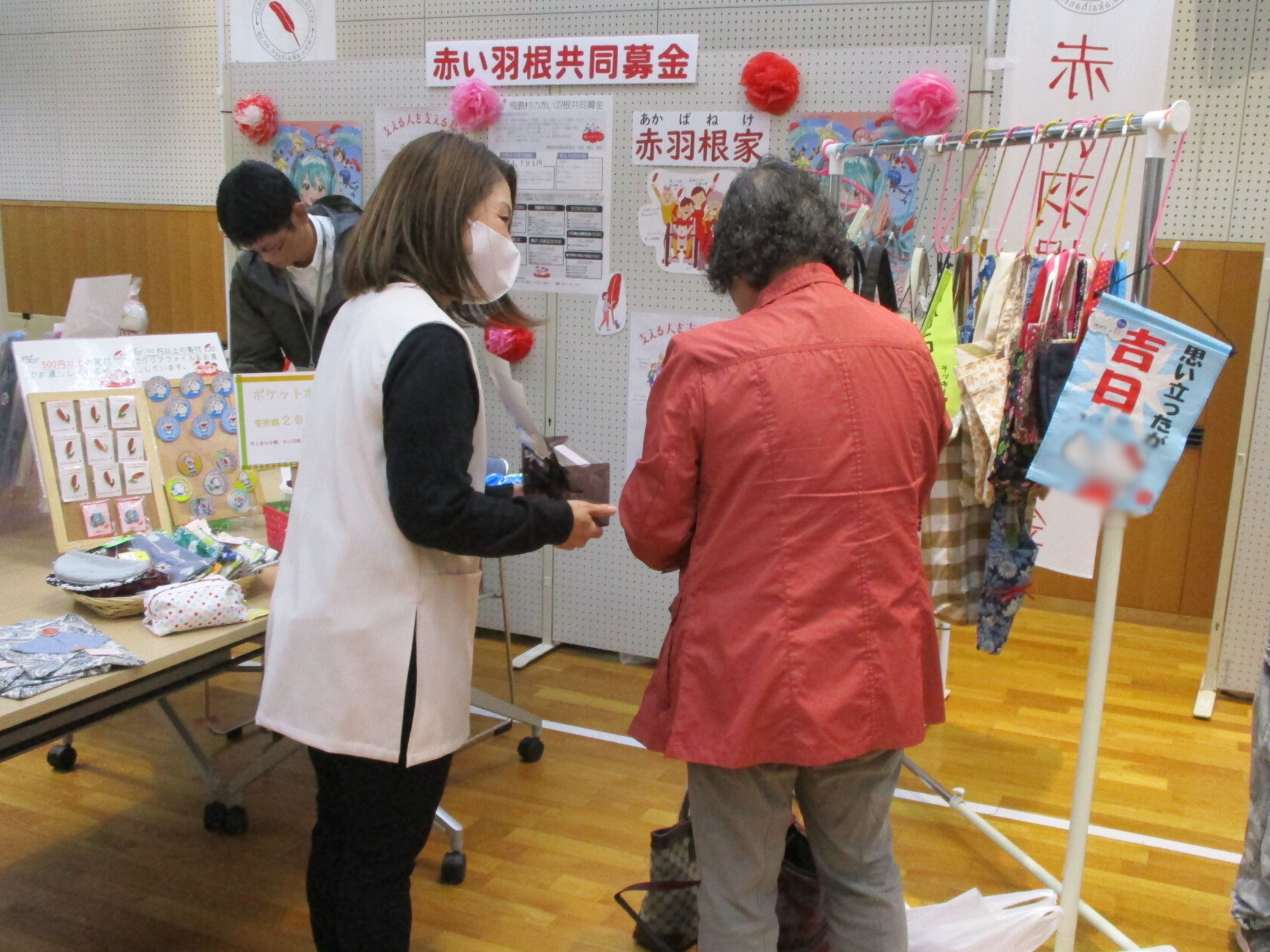 11月1日の健康福祉祭では、高齢者生きがい活動支援事業(さくらの会)の作品つくり「くつ下のぶたさん」つくりの体験ブースをはじめ赤い羽根共同募金活動、心身障害者小規模授産施設さくら作業所の自主製品販売のブースを出展し、点訳の『いととんぼ』のボランティアさんにも協力していただき、点字を打つ体験ブースも出展しました。
