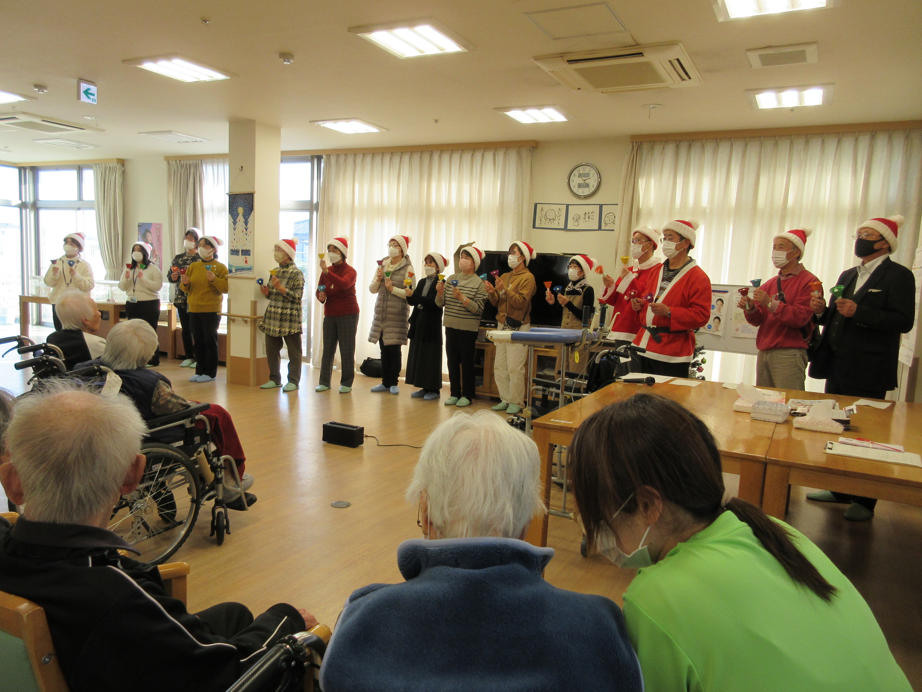 ミュージックベルの奏でる音色に合わせて歌を歌い、慰問に出かけた人も入所者の皆さんの歌声と笑顔で、その場に居合わせた全員が元気をいただける慰問となりました。